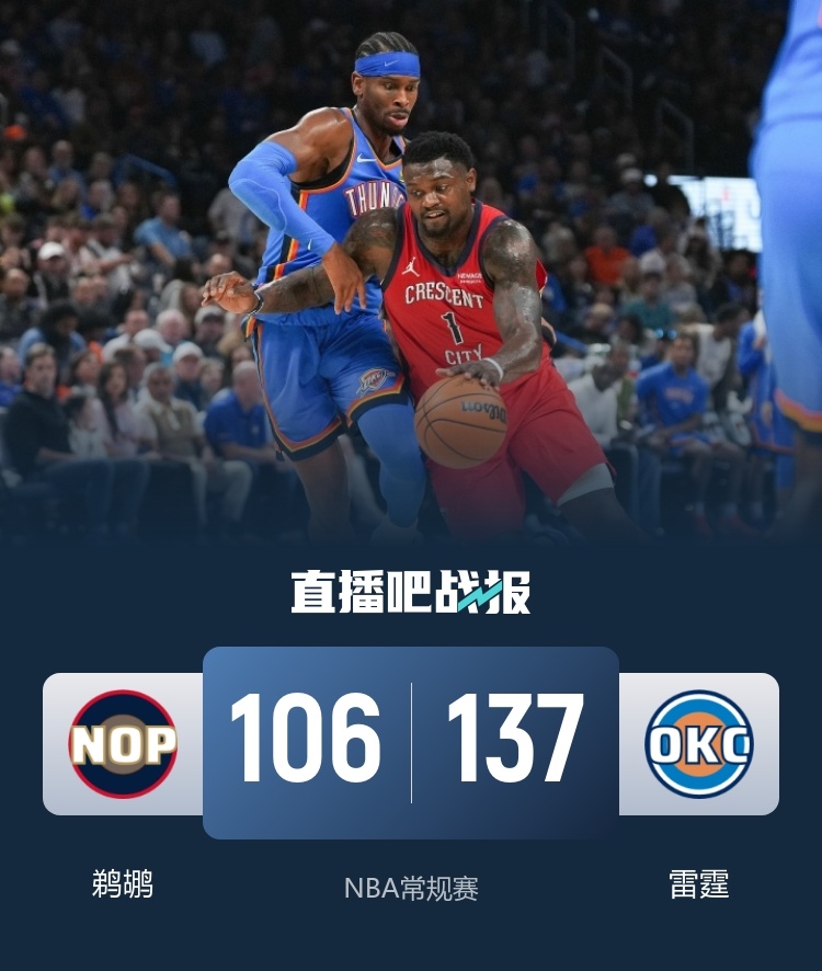 一开场,雷霆率先发力,多点开花很快取得两位数领先,鹈鹕轮番冲击内线苦苦追赶,雷霆攻防两端发力不断扩大优势,次节鹈鹕进攻回暖,但雷霆火力不减,轻松将分差拉开到20分以上,锡安带队苦苦支撑,半场战罢雷霆75-52领先鹈鹕。下半场,亚历山大传射建功,率队牢牢占据场上主动,分差来到30分以上,末节雷霆稳扎稳打保持优势,鹈鹕大势已去无力回天。最终,雷霆137-106大胜鹈鹕,豪取7连胜的同时送给鹈鹕6连败。