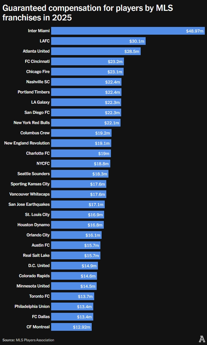 10月30日讯 美国职业足球大联盟球员协会发布了年度球员薪资数据,球队薪资中迈阿密总薪资4897万美元排名第一,球员中梅西2045万美元居首。